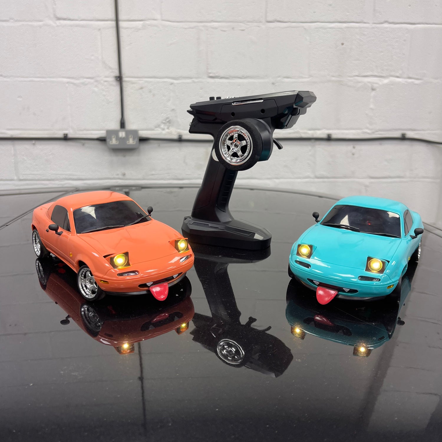 Our Mazda Miata drift car comes in two stunning colours. Each order comes complete with the controller, a rechargeable battery, a USB battery charger, all the necessary parts to put on the car, a screwdriver to disassemble the wheels and battery cover, as well as a removable tongue.